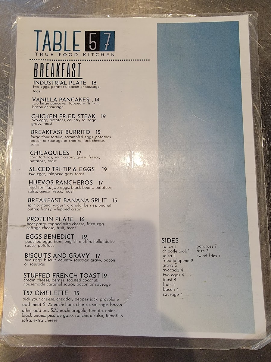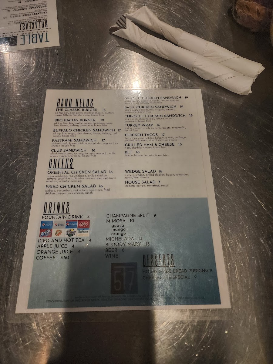 Specializing in classic American fare, Table 57’s menu features a variety of mouthwatering options. The breakfast selection is particularly beloved, showcasing dishes like the vanilla pancakes that one delighted customer raved about as "amazing." For those looking for a hearty brunch, the chicken fried steak has captured the hearts of many—one diner even declared it "probably the best" they've ever had! The lunch menu offers flavorful choices such as the BBQ Bacon Burger and the well-loved Buffalo Chicken Sandwich. Each dish is crafted with care and showcases quality ingredients, maintaining a balance that satisfies without overwhelming the senses.